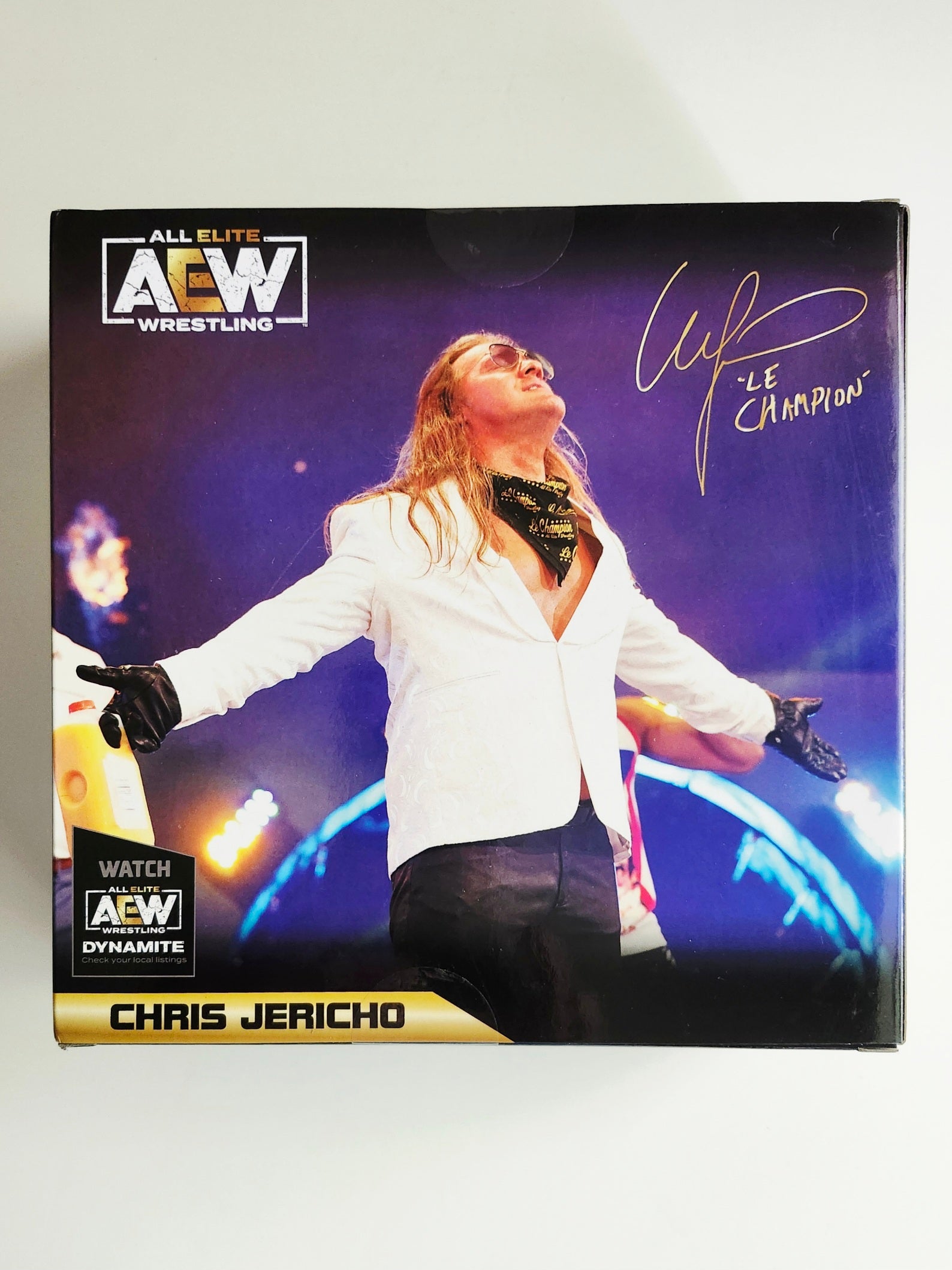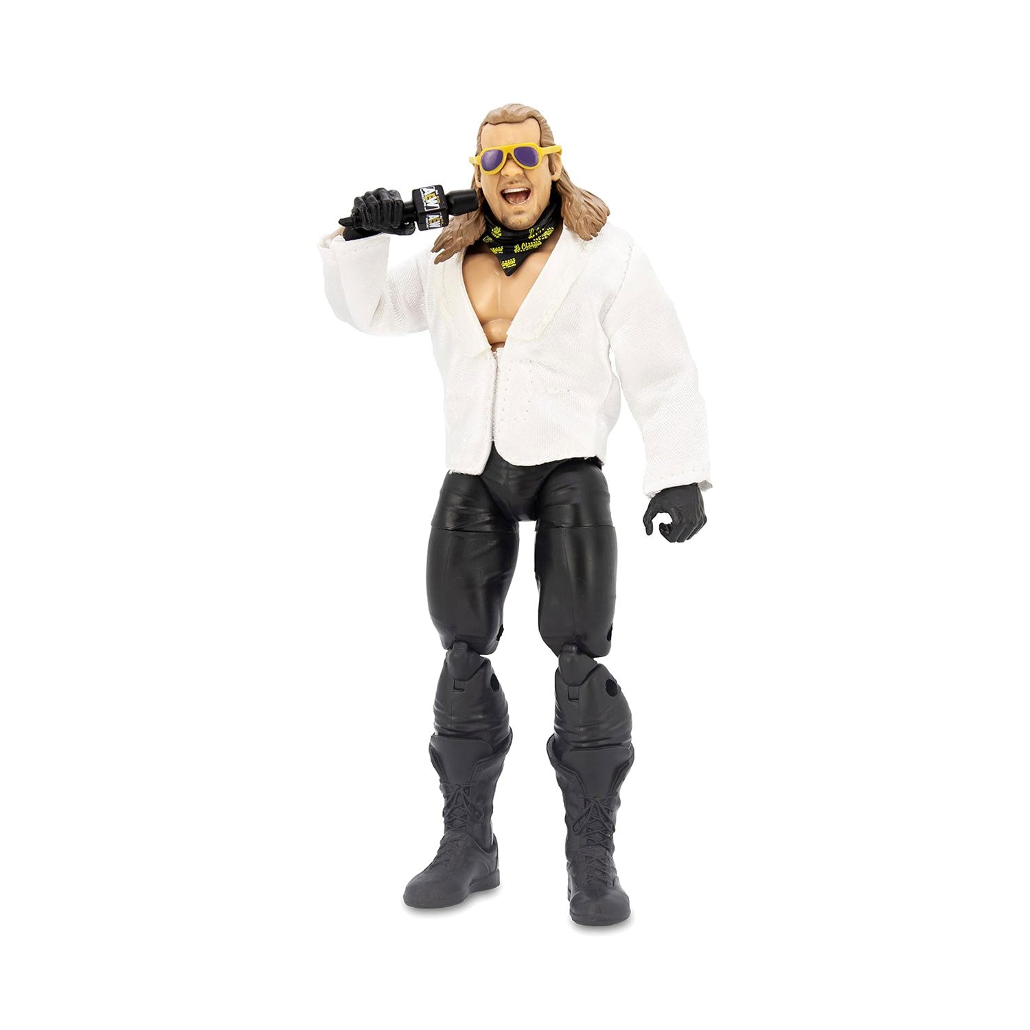 This action figure features a highly detailed and fully poseable Chris Jericho. The figure's accessories include two shirts, a bandana, sunglasses, an AEW microphone, and an extra pair of hands.