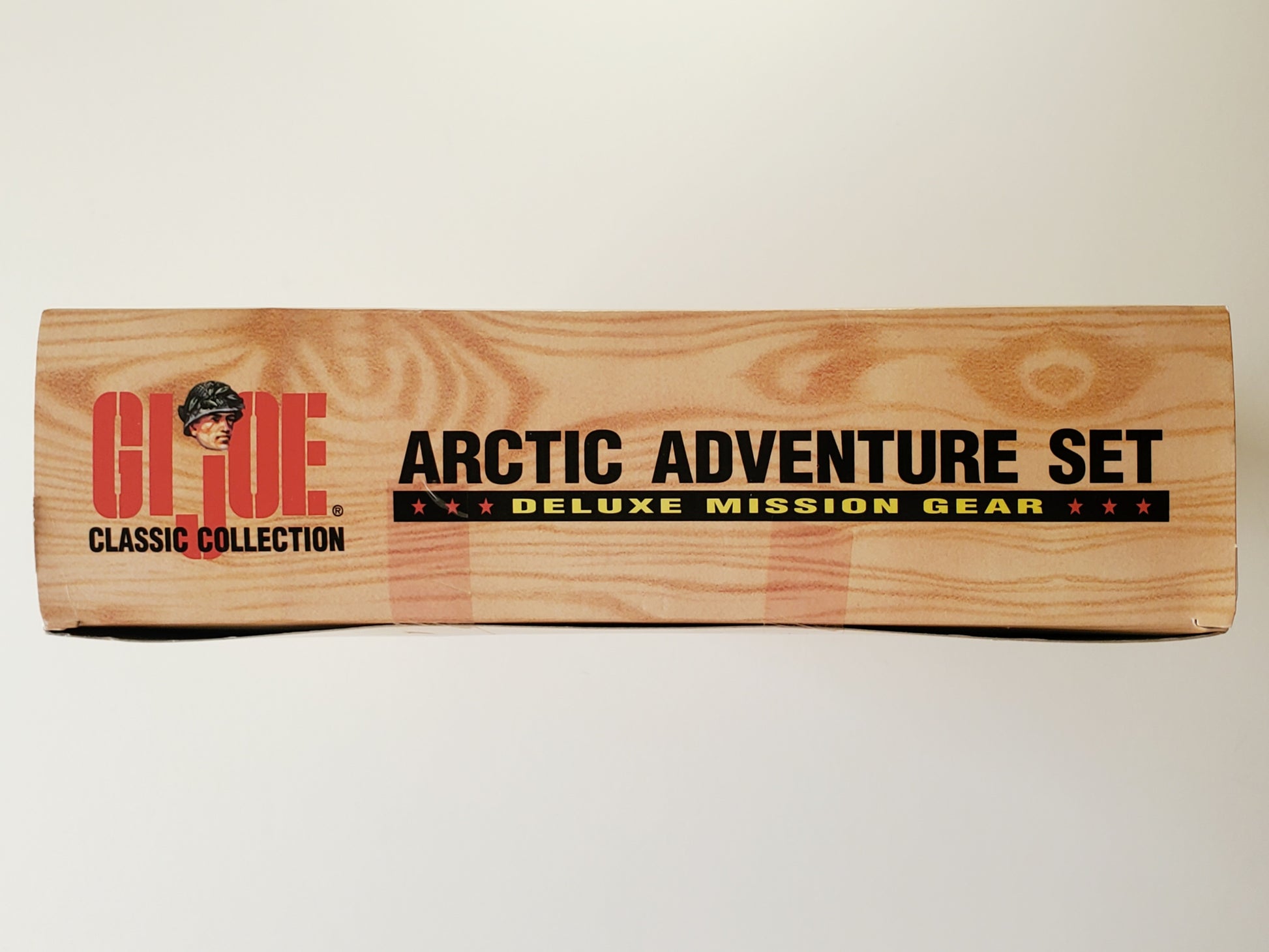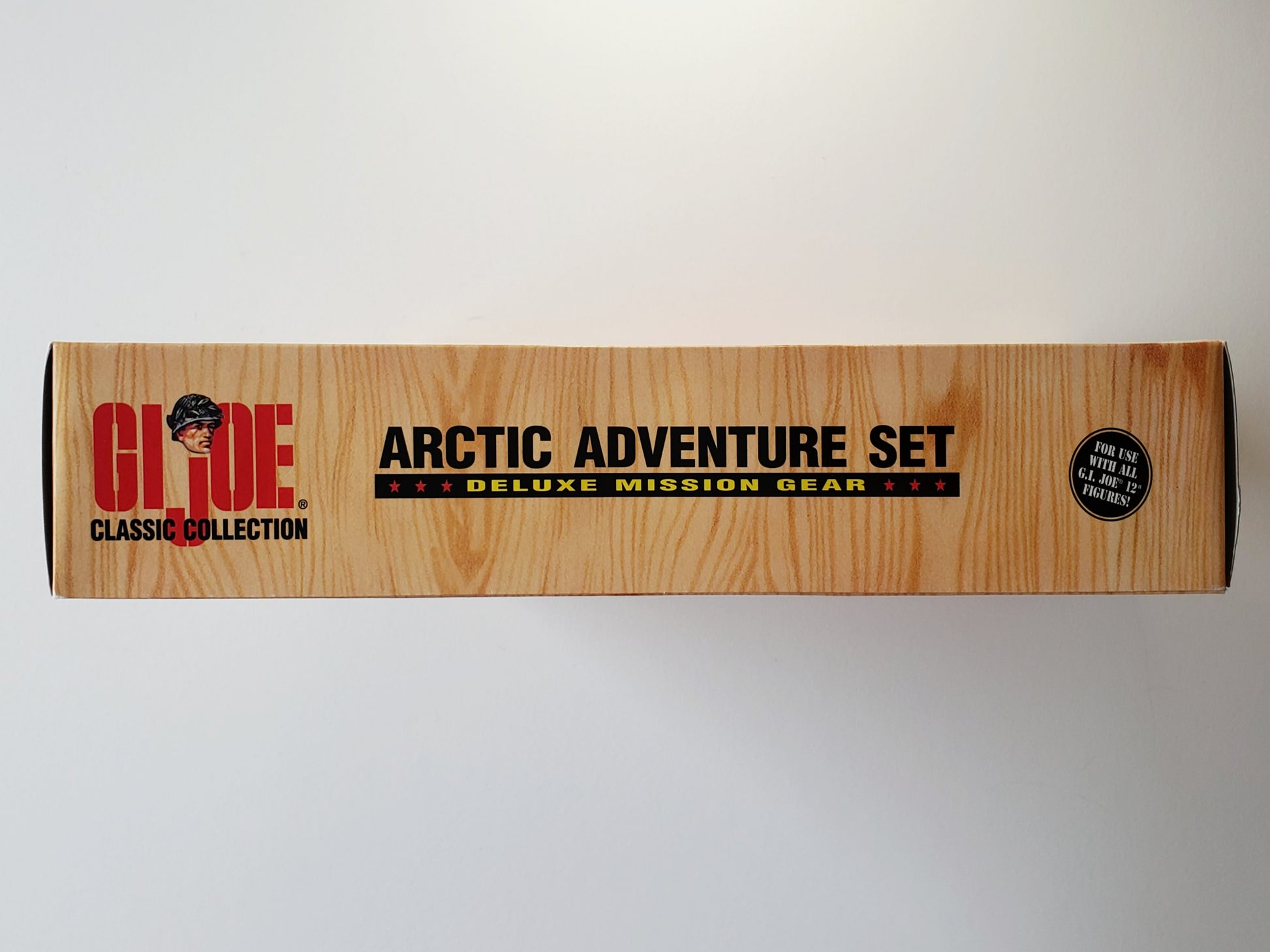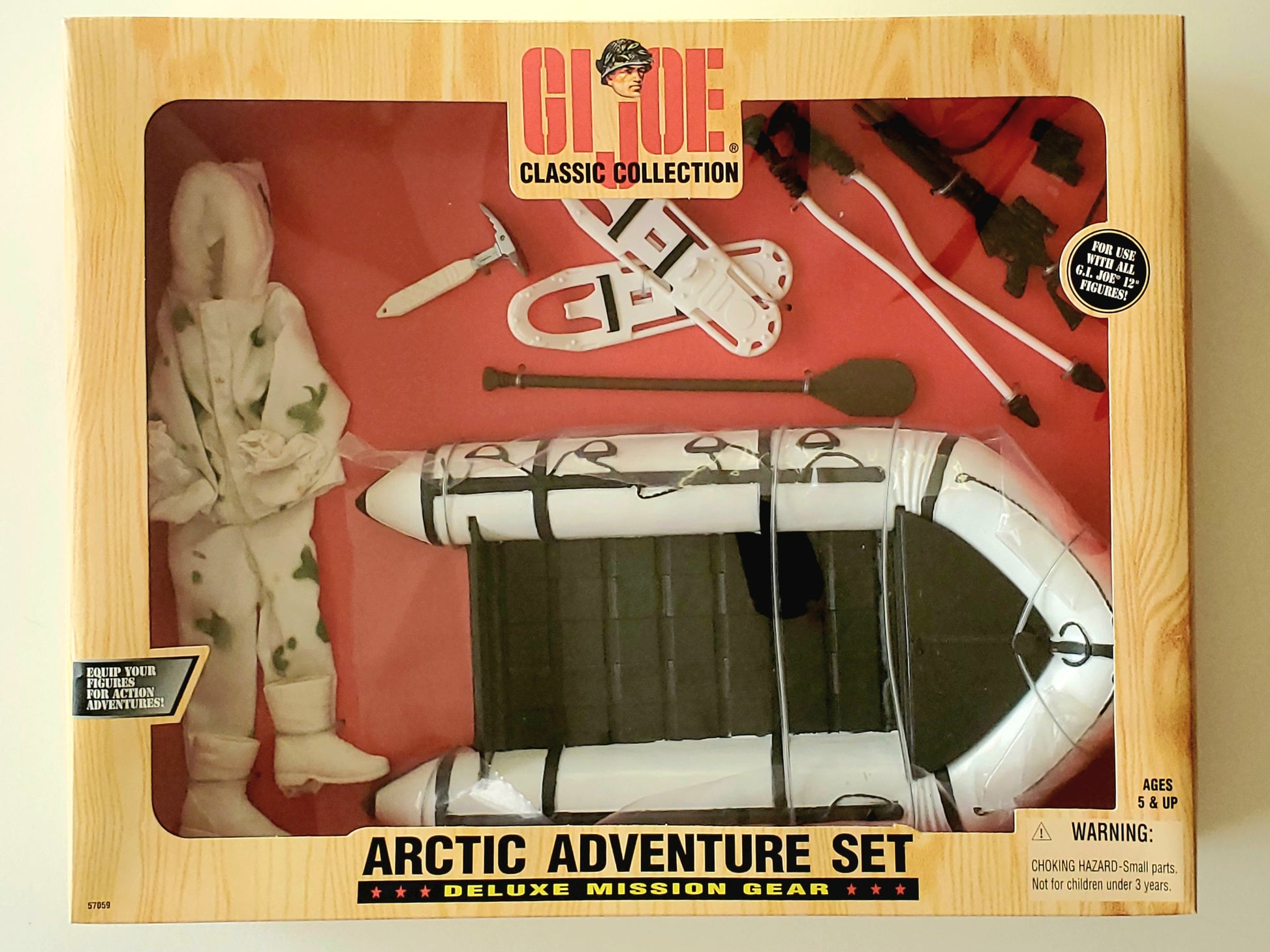 This G.I. Joe Arctic Adventure Set includes accessories for 12-inch figures including a raft with a storage compartment, a paddle, a camouflage snow suit, boots, mittens, two snow shoes, two ski poles, a snow shield mask, a gun, a gun strap, two removable cartridges, and a pickax.