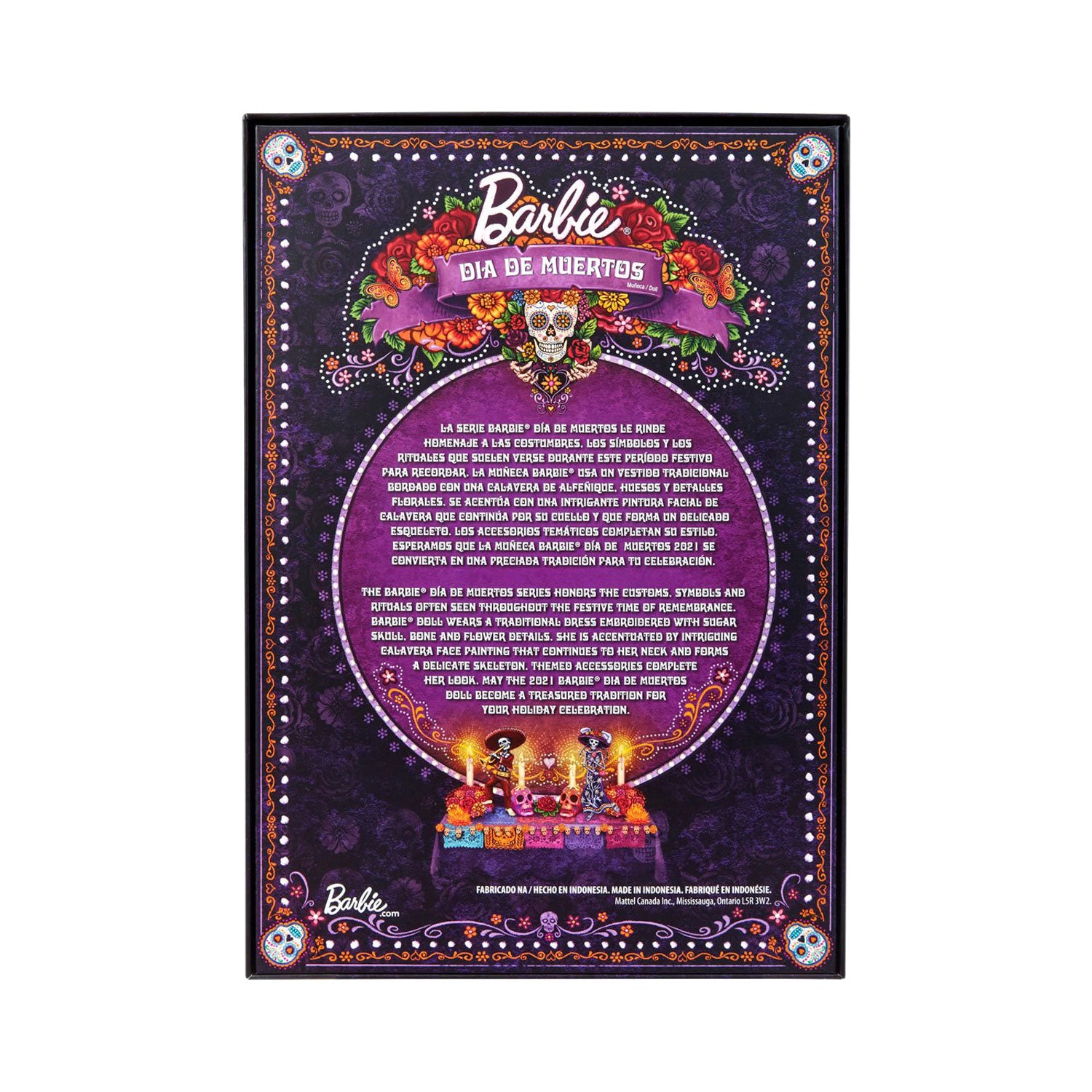 The Barbie Dia De Muertos series honors the customs, symbols and rituals often seen throughout the festive time of remembrance. Barbie celebrates the time-honored holiday with the 2021 Dia De Muertos Barbie doll in a traditional dress embroidered with sugar skull and flower details. A crown of marigolds with hidden skull details adorns her hair, complemented by a twisted headband detail. Her hair is pulled back to accentuate the calavera face painting that continues to her neck and forms a delicate skeleton. Vibrant bracelets complete her look. In packaging featuring an original illustration, this collectible doll is ideal for display and gifting. This set includes doll, a doll stand, and a certificate of authenticity.