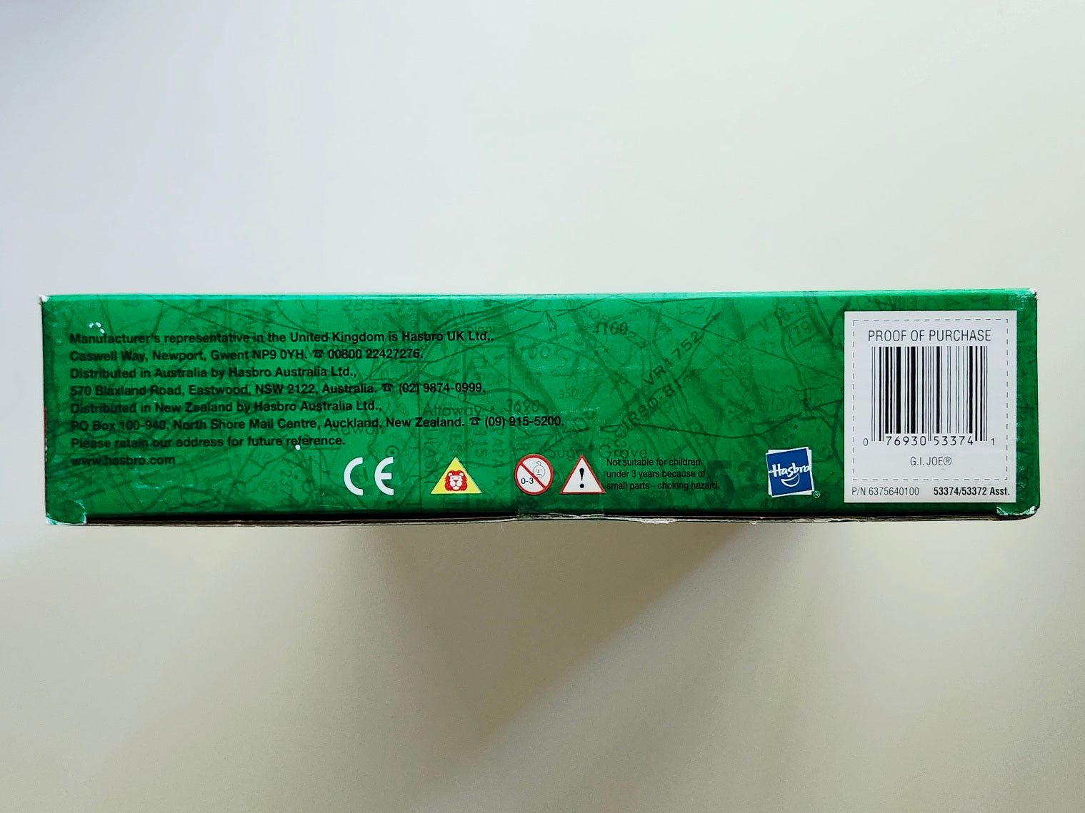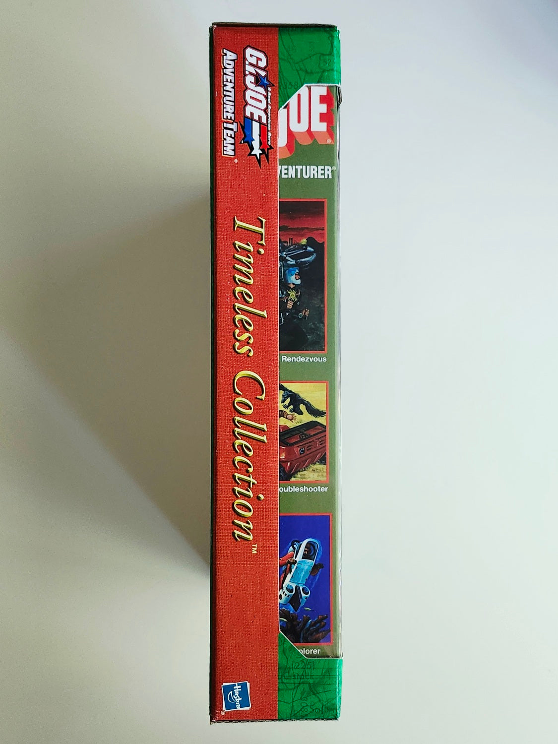 This G.I. Joe Adventure Team set includes a super-poseable 12-inch G.I. Joe figure, pants, a shirt, a shoulder holster, boots, a pistol, a facemask, a searchlight, binoculars, a walkie-talkie, a morse code kit, a gun, a gun case, a field radio, a dog tag with a chain, and a Land Adventurer coffin box.
