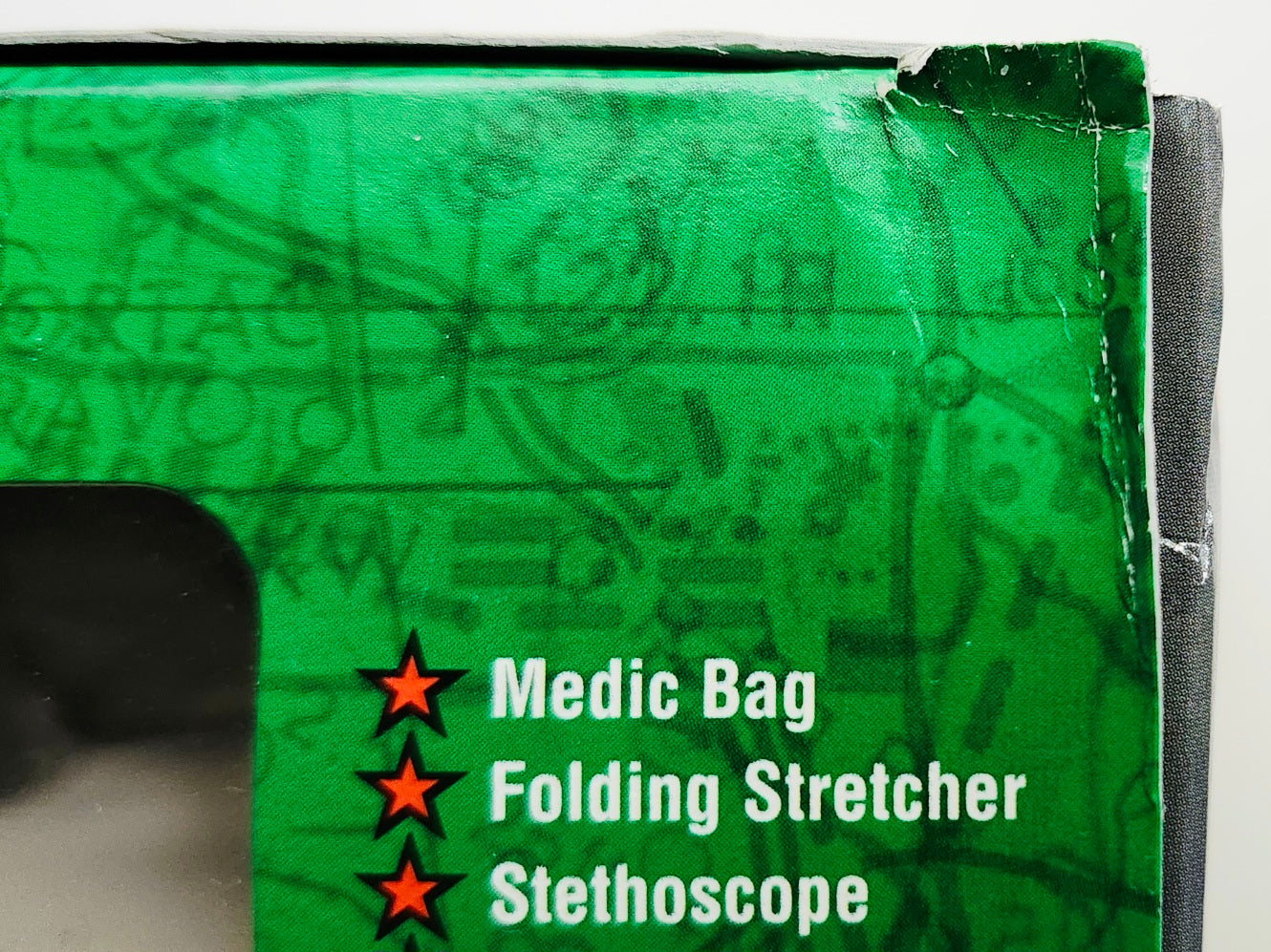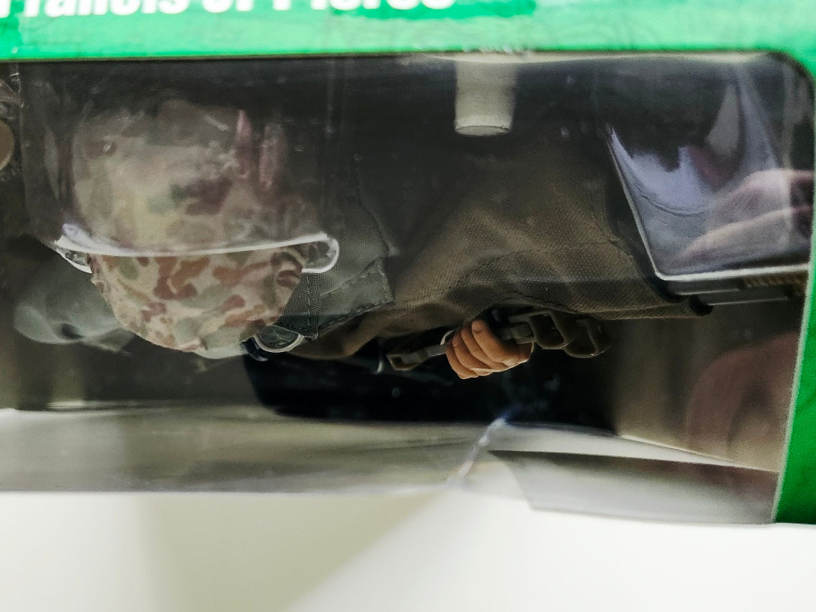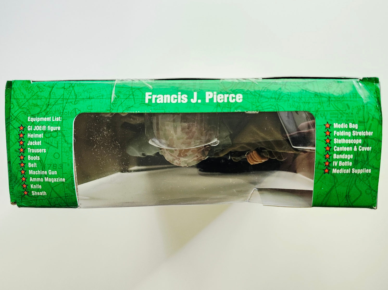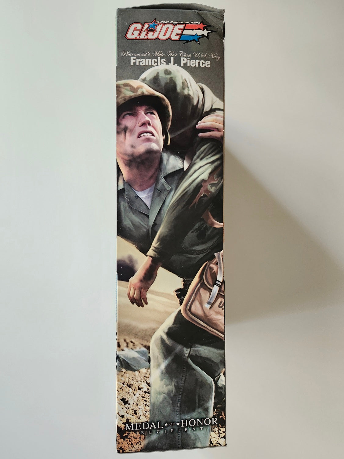 This rare 2003 G.I. Joe action figure features the Medal of Honor recipient Pharmacist's Mate First Class of the U.S. Navy Francis J. Pierce. The set includes a medic bag, a folding stretcher, a stethoscope, a canteen and a cover, a bandage, an IV bottle, and medical supplies.