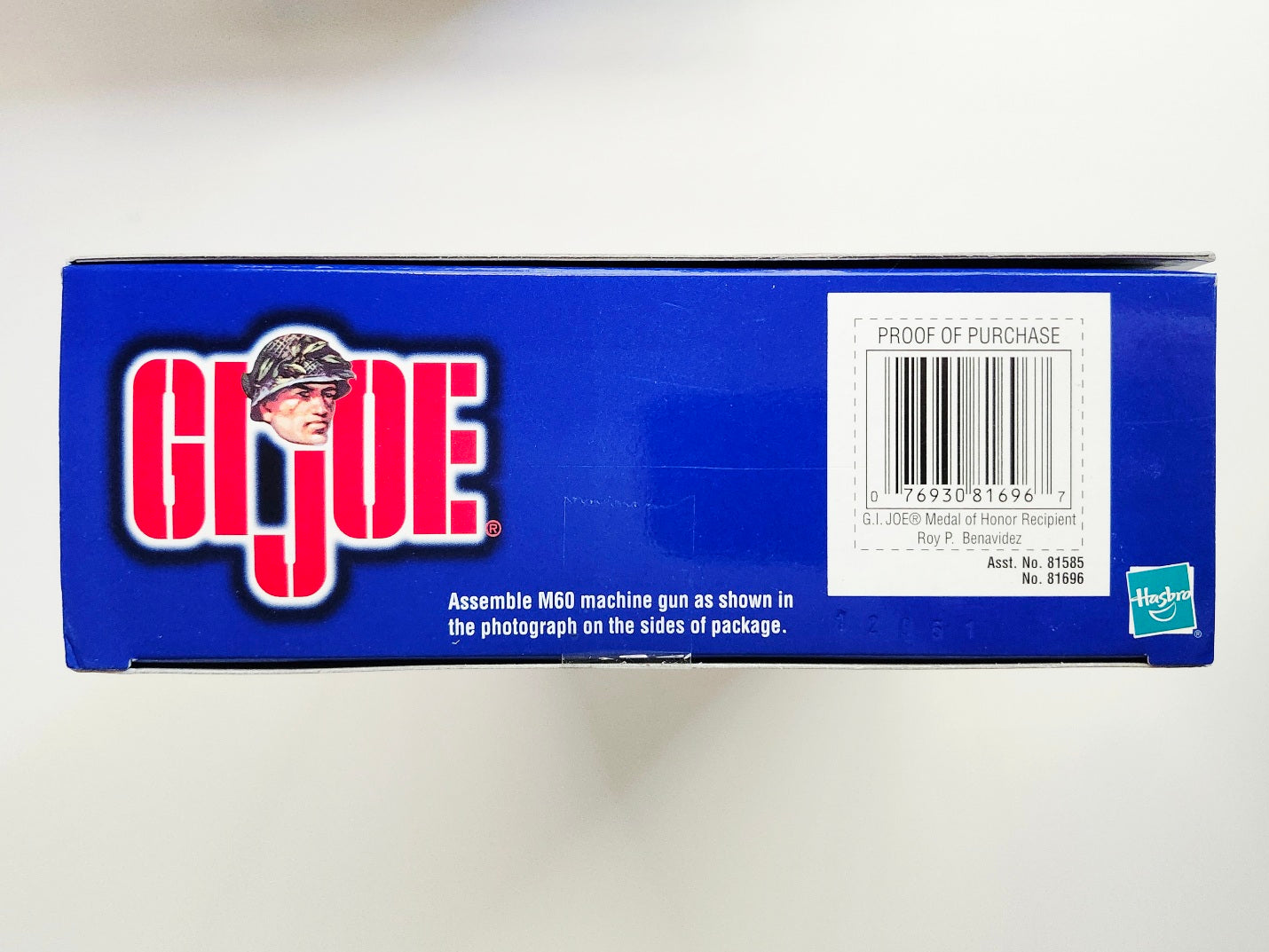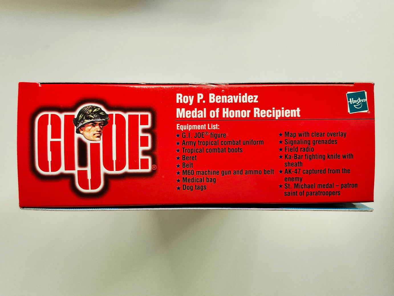 This 2001 Medal of Honor Recipient Roy Benavidez set includes a 12-inch G.I. Joe figure, a Vietnam Army tropical combat uniform, combat boots, a beret, a belt, an M60 machine gun with an ammo belt, a medical bag, a map, signaling grenades, a field radio, a ka-bar knife in a sheath, an AK-47 captured from the enemy, a St. Michael medal (patron saint of paratroopers), and dog tags.