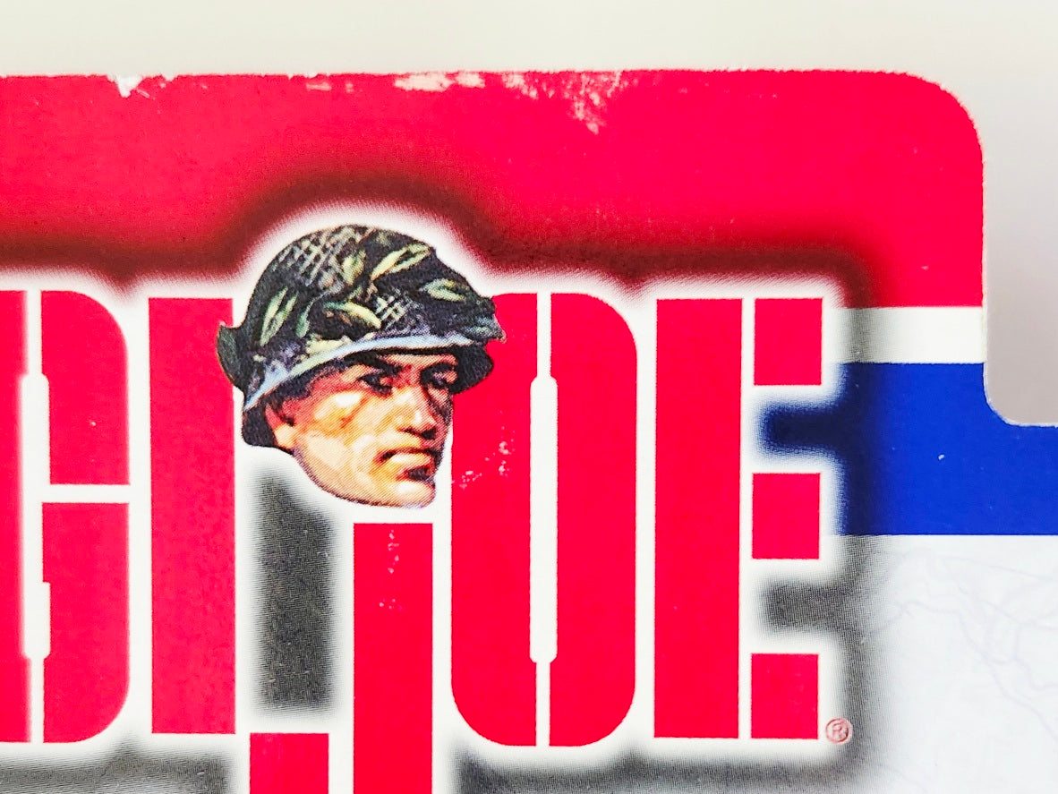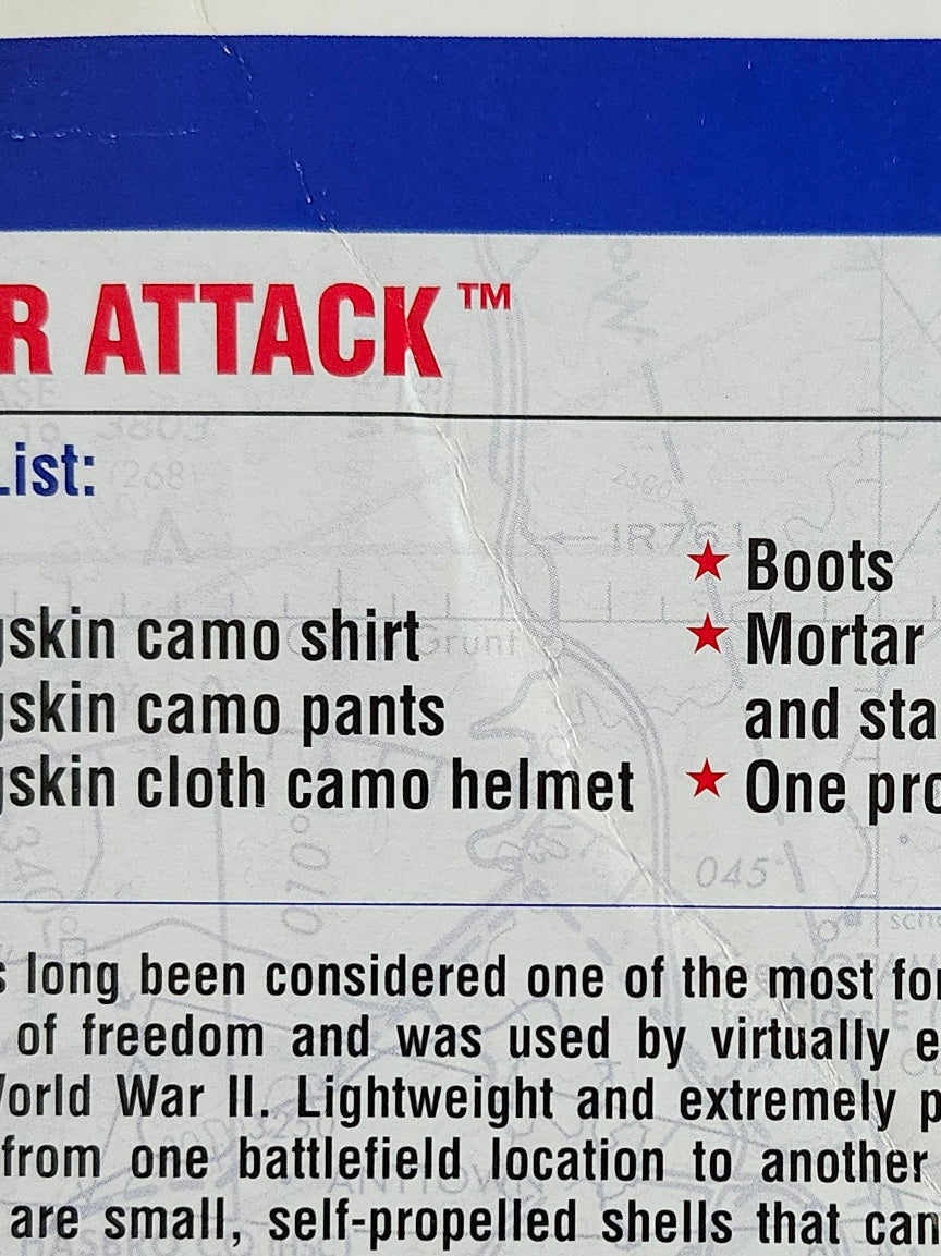 This G.I. Joe Mortar Attack figure comes with a green frogskin camo shirt, pants, a cloth camo helmet, boots, a mortar launcher with a base, one projectile, and dog tags.