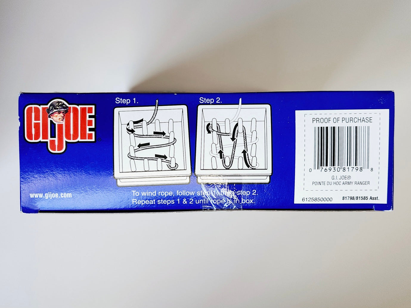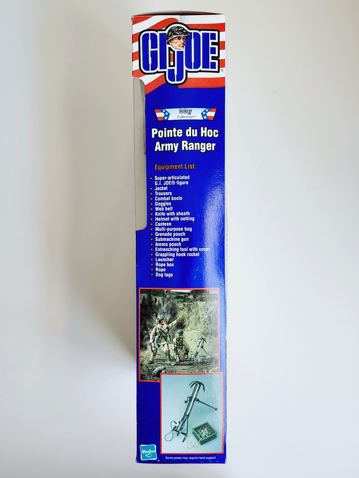 The 2001 Pointe du Hoc Army Ranger set includes a 12-inch G.I. Joe with a jacket, trousers, combat boots, goggles, a web belt, a knife with a sheath, a helmet with netting, a canteen, a multi-purpose bag, a grenade pouch, a submachine gun, an ammo pouch, an entrenching tool with a cover, a grappling hook rocket, a launcher, a rope box, a rope, and dog tags.