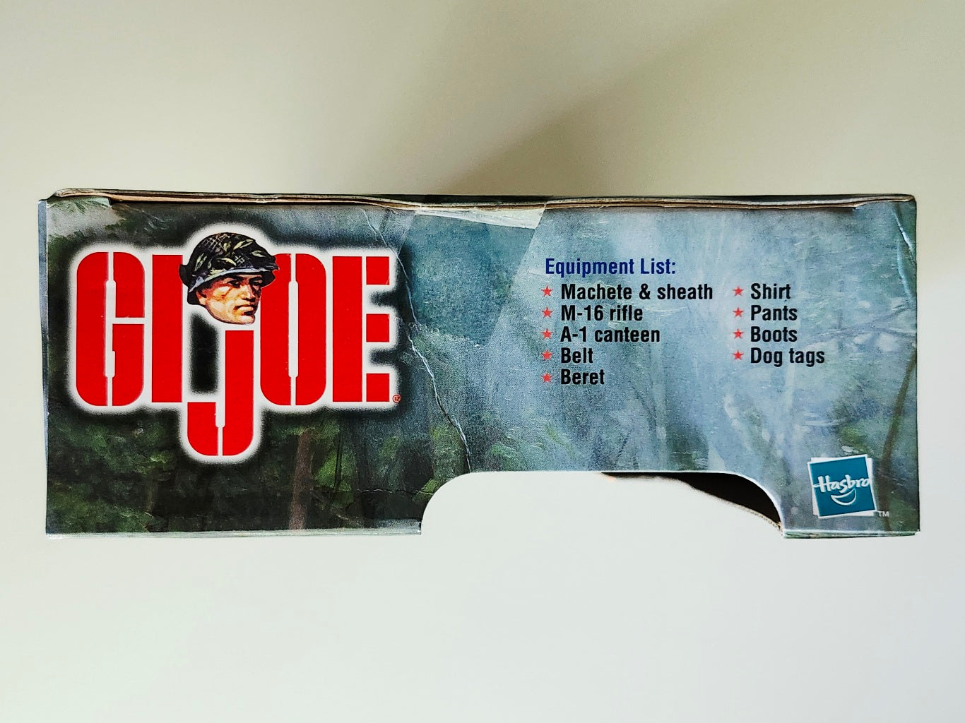 This 12-inch G.I. Joe figure from 1999 comes in a display box that demonstrates its machete chopping action. This set includes a machete with a sheath, an M-16 rifle, an A-1 canteen, a belt, a beret, a shirt, pants, boots, and dog tags.
