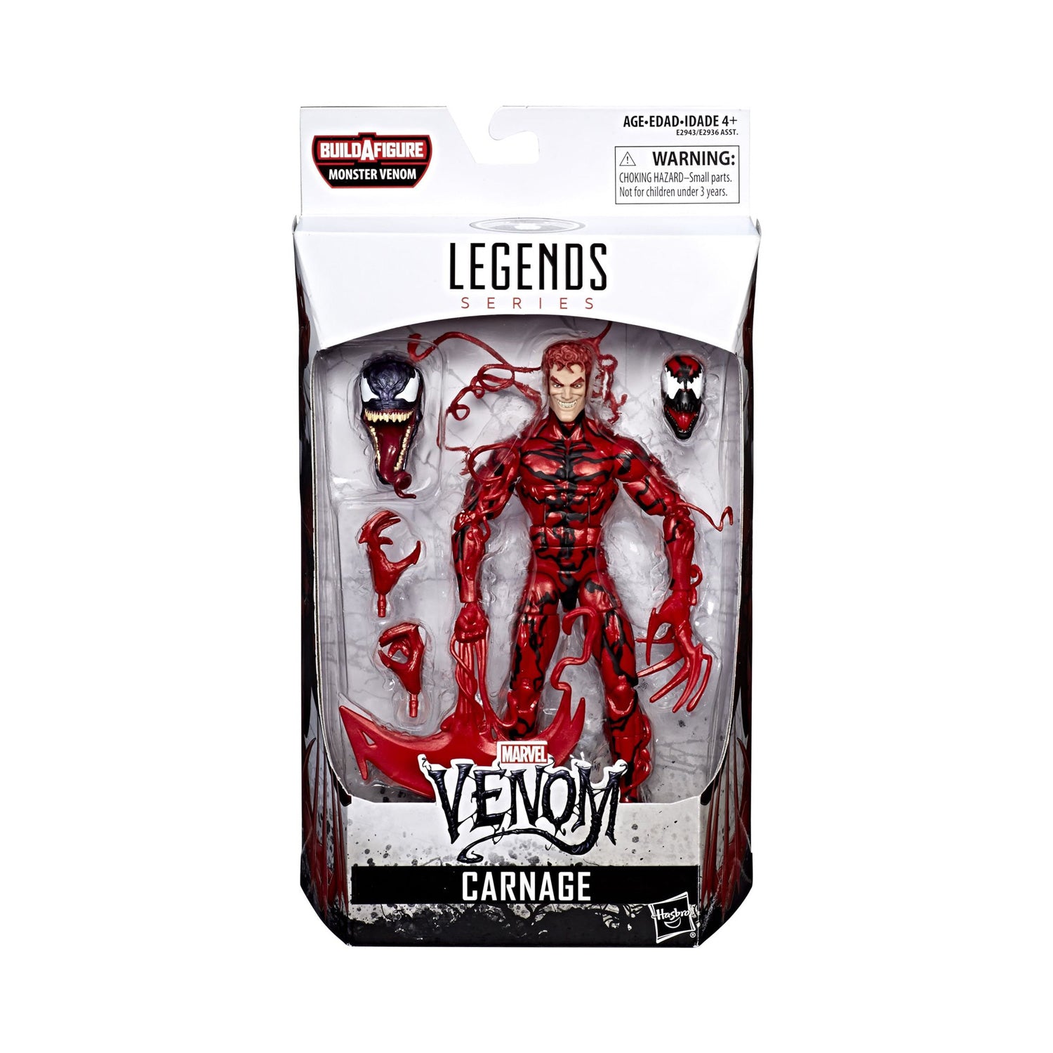 This Marvel Legends Carnage action figure is highly-detailed and super-poseable. This set includes an axe hand, an alternate unmasked head, alternate hands, and a head that can be used for the Monster Venom build-a-figure.