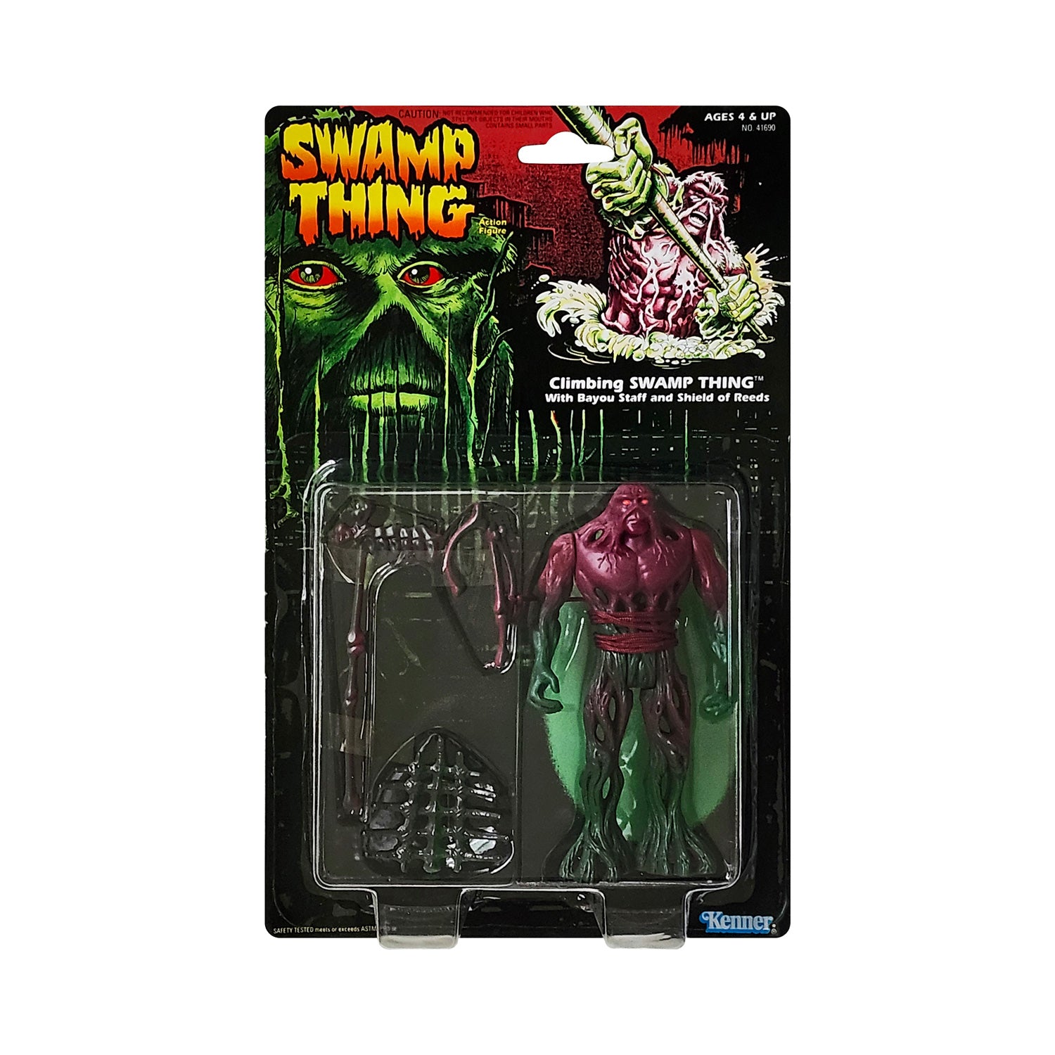 This Swamp Thing figure from Kenner is approximately five inches tall and comes with pretend accessories, such as a climbing string, a bayou staff, and shield of reeds.