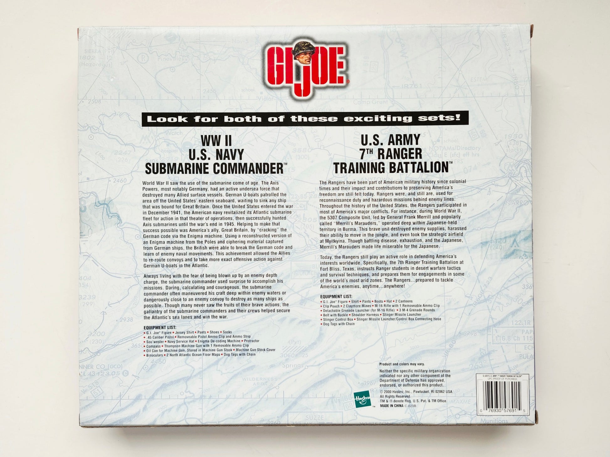 This 12-inch G.I. Joe set from 2000 comes with a shirt, pants, boots, a hat, two canteens, a clip pouch, two Claymore mines, an M-16 rifle with one removable ammo clip, a detachable grenade launcher for the M-16 rifle, three M-4 grenade rounds, a belt with a buckle, a shoulder harness, a stinger missile launcher, a stinger control box, a stinger missile launcher/control box connecting hose, and dog tags with a chain.