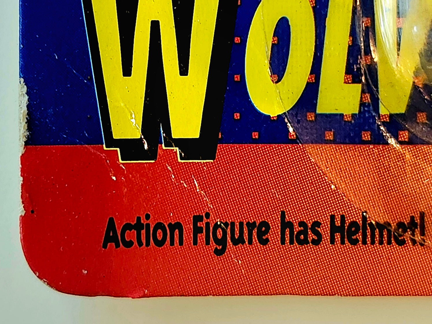 Produced by Toy Biz, this very rare 5-inch scale Wolverine action figure variant with silver cables and blue shorts features a "high-tech training helmet."