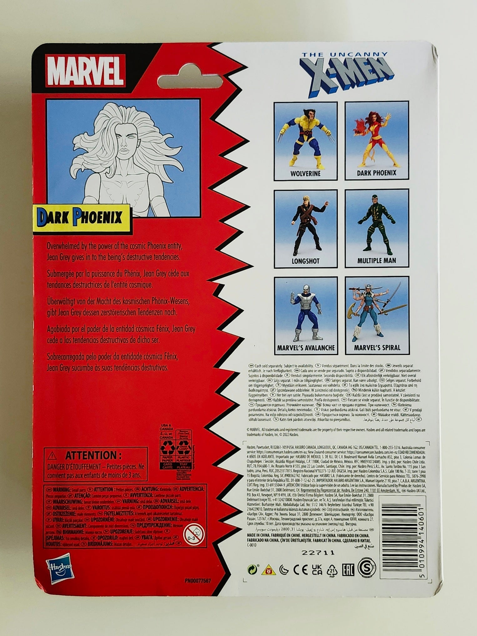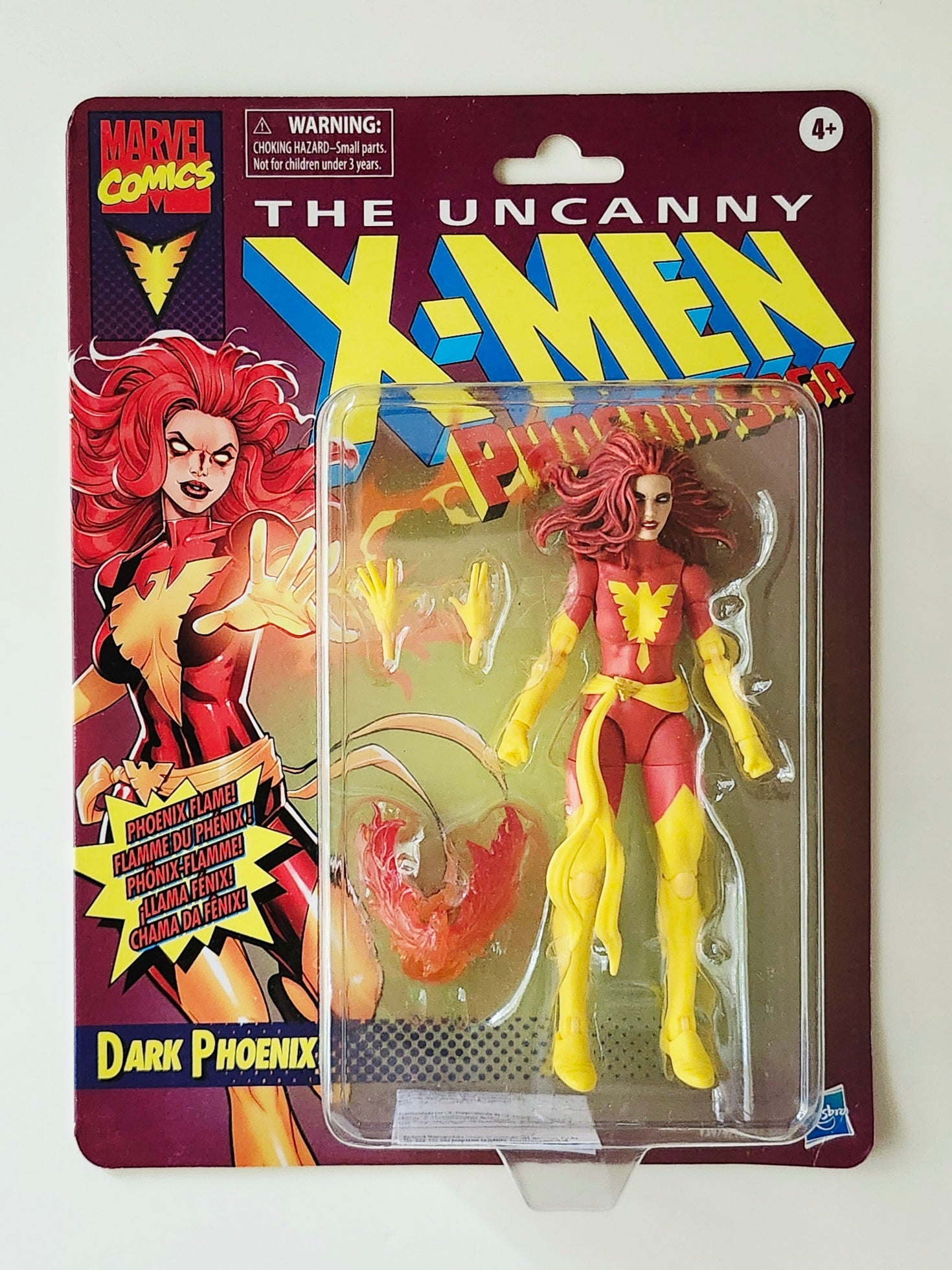 This figure from Marvel's retro line of six inch action figures features a highly detailed, super-poseable Dark Phoenix. The figure features a phoenix-shaped fire effect and an alternate pair of hands.