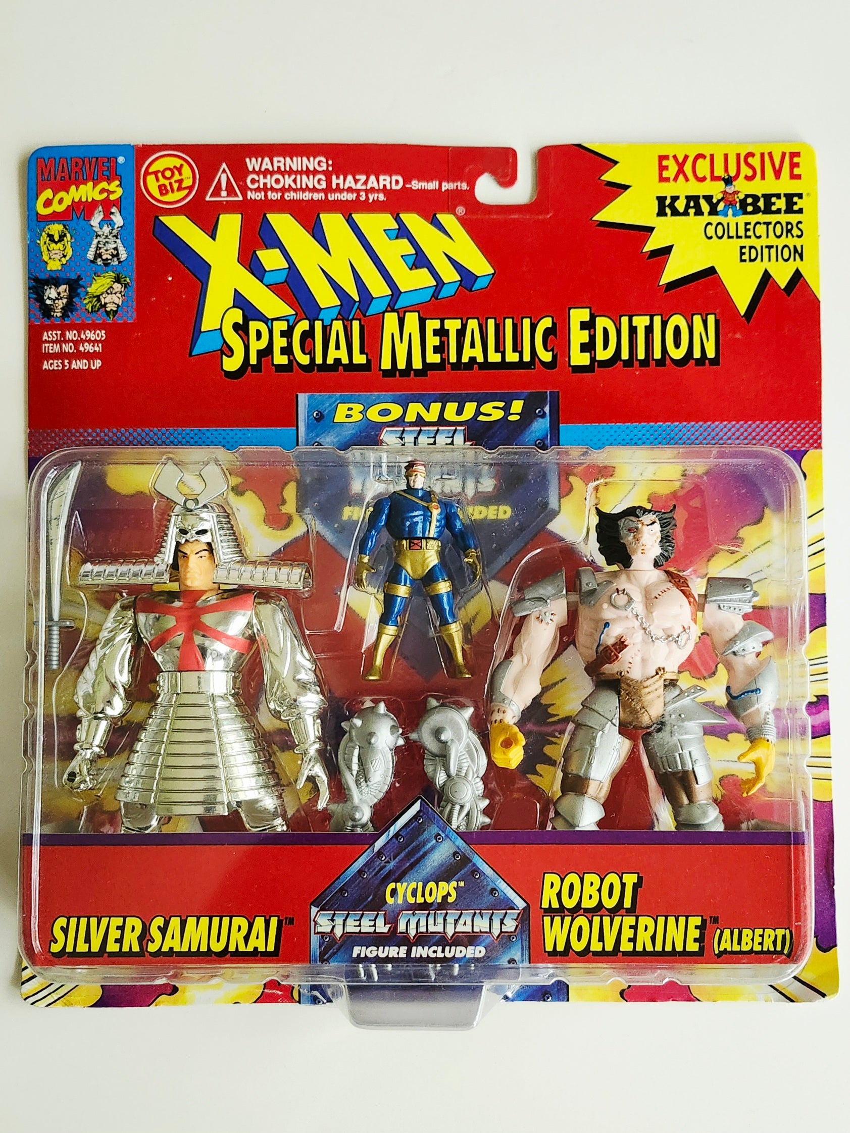 This Special Metallic Edition action figure set comes with two poseable 5-inch action figures of Silver Samurai and Robot Wolverine and one 2-inch die cast figure of Cyclops.