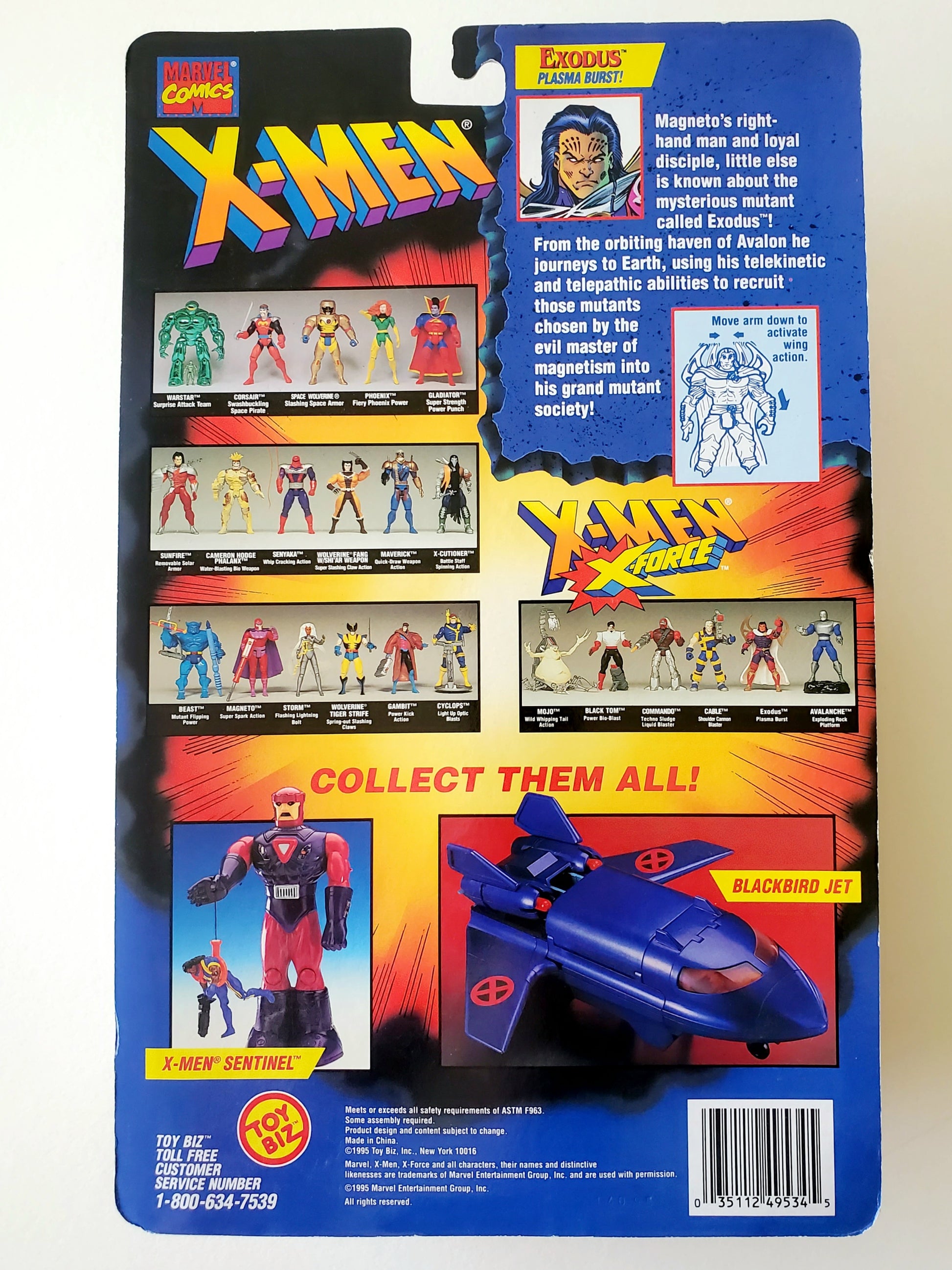 Produced by Toy Biz, this 5-inch scale Exodus action figure features clip-on accessories, a plasma burst, and flapping wings.